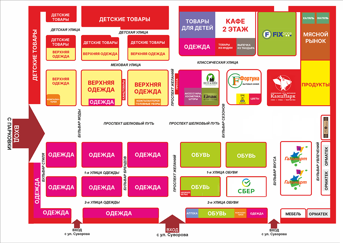 Торговый комплекс оснащен автомобильной парковкой на 700 мест с удобным въездом с улицы Суворова. Рядом с парковкой находится круглосуточная мойка.